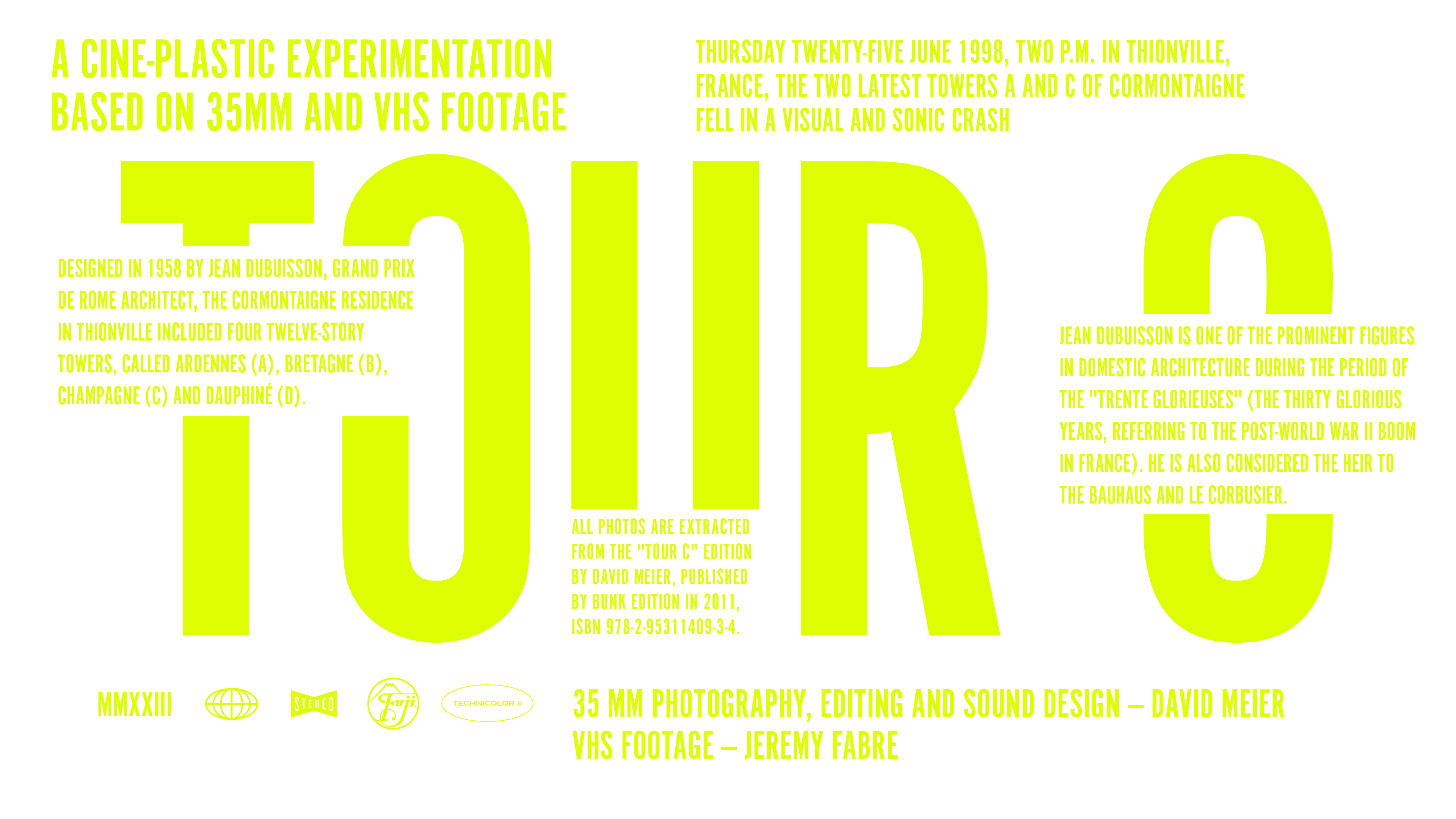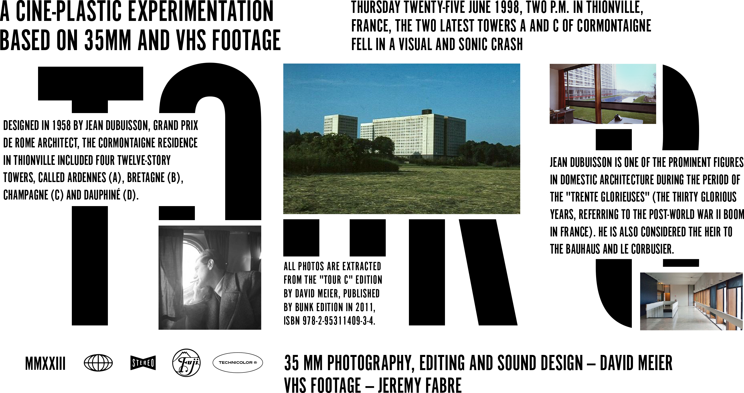 Tour C, fruit d’une expérimentation ciné-plastique, puise son inspiration dans les photographies capturées avant la démolition de l’une des tours du complexe Cormontaigne à Thionville, une œuvre signée par l’architecte Jean Dubuisson, lauréat du Grand Prix de Rome. Le complexe Cormontaigne, composé de quatre tours de douze étages chacune, portait les noms d’Ardennes (A), Bretagne (B), Champagne (C) et Dauphiné (D).